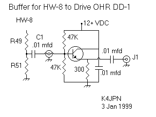 The following is a simple circuit I developed for driving my OHR DD-I Digital Dial from my HW-8. I found that trying to take the output off the VFO directly and several other places resulted in the counter clock getting into the receiver or the counter being sensitive to RF when the rig was keyed. The circuit was built on a piece of perf board and mounted on the inside back of the cabinet. Mount C1 on the circuit board at the junction of R49 and R 51. It is also important you use good shielded wire from C1 to the input of the buffer. It is also important that the shield be grounded at both ends. I found the lug attached at the VFO capacitor made a good ground for the shield at the input end. The output of the circuit should be mounted as close as possible to J1, again use good shielded wire grounded at both ends.